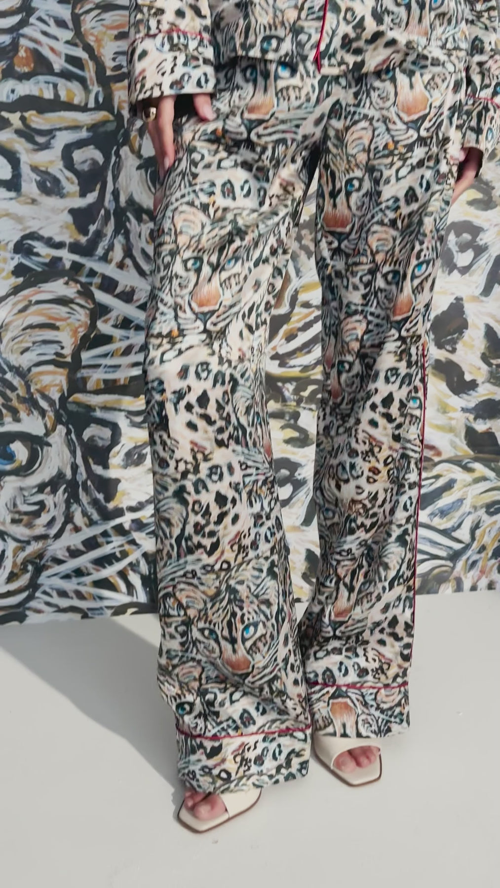 Our Sobel Pajama Pants in Snow Leopard are what dreams are made of with a draw string front, and comfortable elastic waistband. We're wearing the silk charmeuse pajamas with red silk piping into zoom meetings, slow mornings while nursing a cup of coffee, and of course, bedtime. Featuring the Snow Leopard print painting by our founder Ala, she loves wearing the pants with the matching Helen Top or the Margaux KimonoPerfect for a night in your favorite hotel or an evening out on the town.