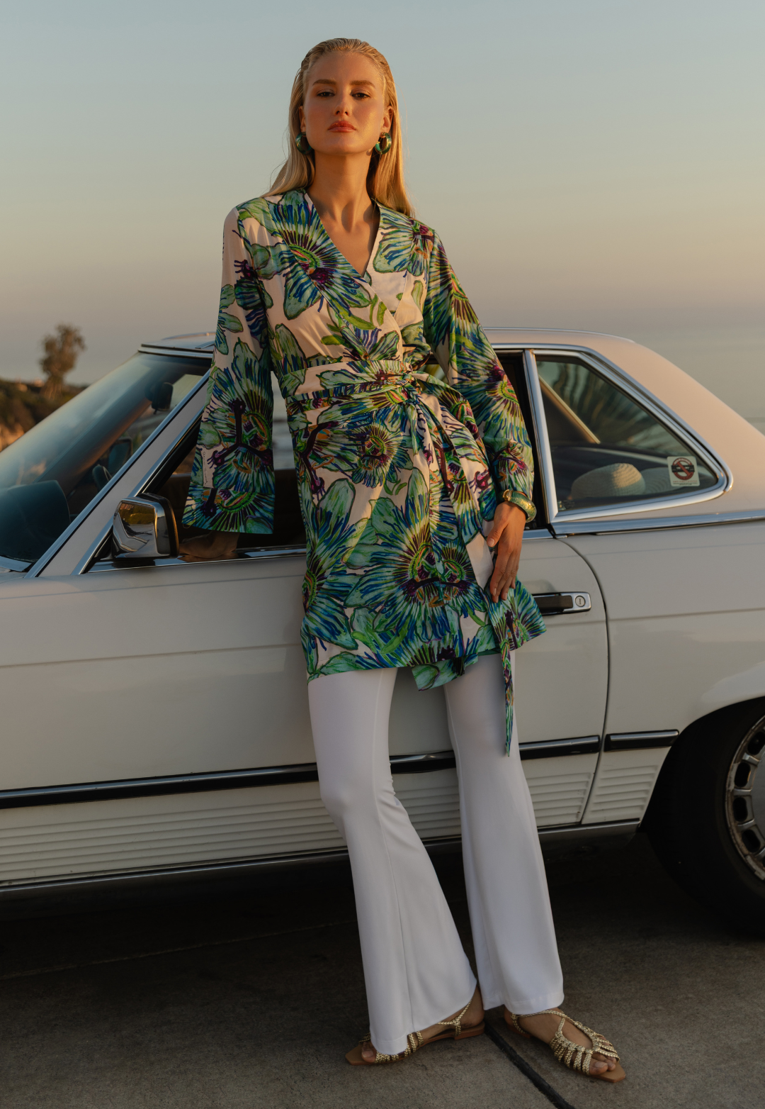 Light, expressive, and endlessly wearable, the Sora Cotton Kimono in White Passion Flower is the kind of piece that makes getting dressed feel instinctive. Crafted in airy cotton voile, the fluid silhouette drapes softly over the body, brought together with an invisible interior tie and finished with a matching sash for flexible styling. Ala’s Passion Flower artwork blooms across a luminous white ground, giving the kimono a sense of movement and artistry that feels equally at home while traveling, entertaining, or stepping out for an unplanned evening. Worn open or cinched at the waist, Sora is relaxed elegance at its most refined. Made in New York City.