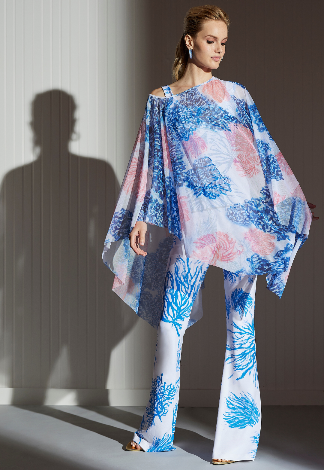 Woman wearing sheer printed mesh poncho over a matching printed pant with coordinated blue coral earrings by designer Ala von Auersperg for women's luxury travel fashion