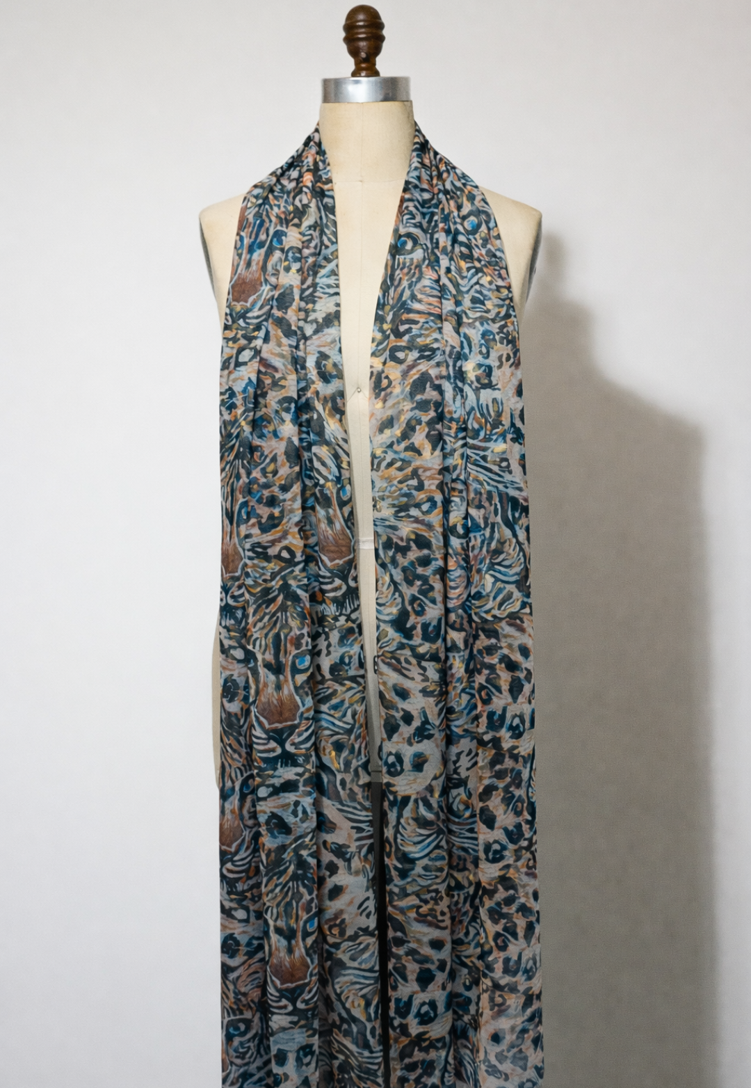 Leopard scarf on a mannequin against a plain background